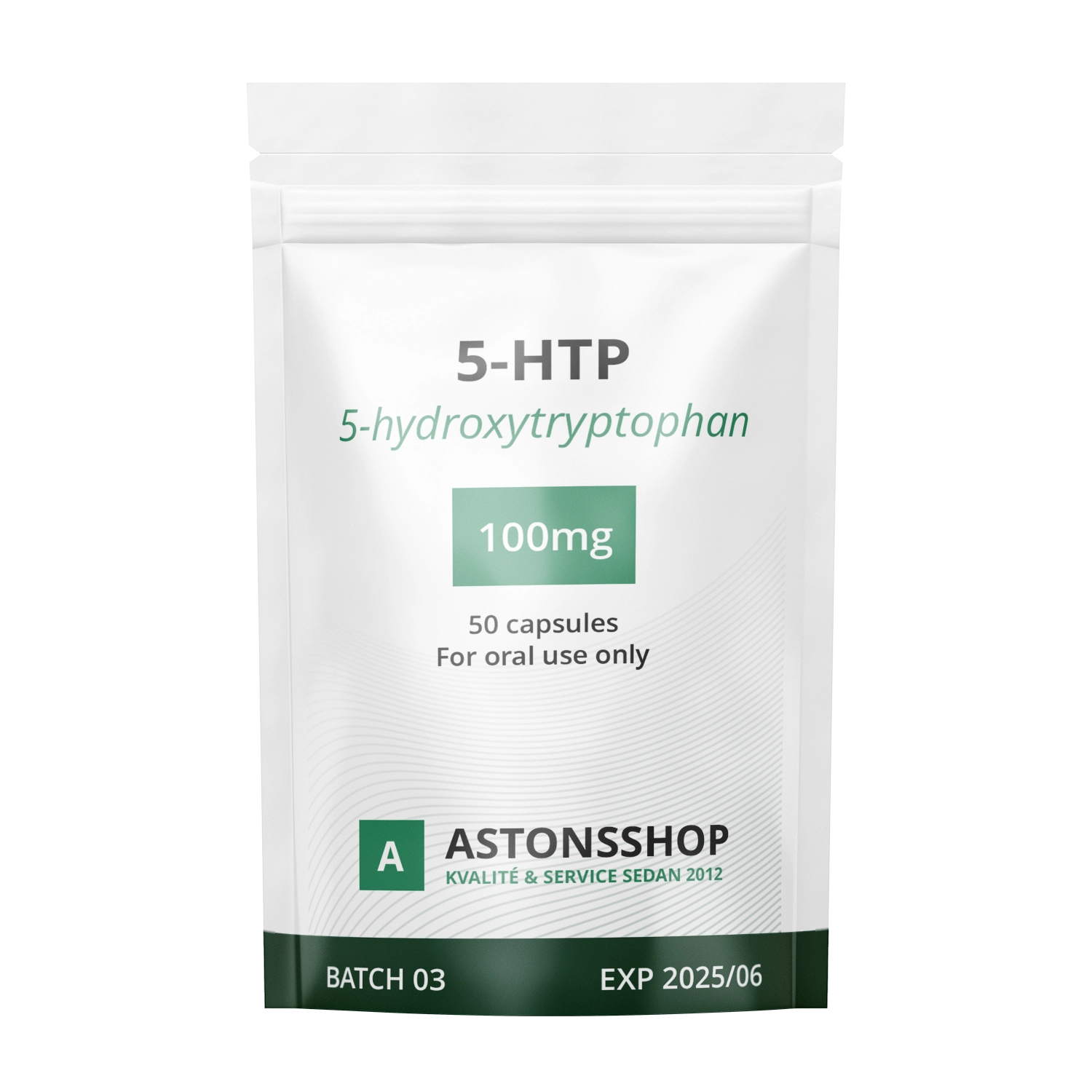 5-HTP 100mg från Astons, kommer i förslutningsbar påse med 50st kapslar.